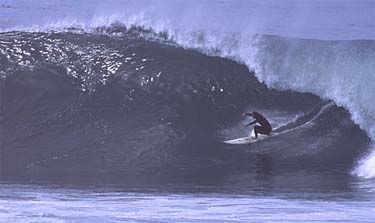 Friday the swell peaked, solid six-to-eight with plenty of outside sets over that. Friday just happened to be my birthday, not saying what the number is but it requires a calculator for me to figure it out. I had a great time, the sun shone, then a bit of fog rolled in. I surfed a break that handles rights at high water for about two hours, must have scored dozens of waves. Finally, tired, I started planning how to get in, not a small thing when you're bone tired and the tide is high and the sand is gone and there are only rocks lining the shore. I should have just turned and paddled in, but, a la Shaun Tomson and his book, the SURFER'S CODE, I decided to wait for a good one to ride on in. Well, I got my rear end caught inside. Since I was riding a small gun, a rather heavy 7'6", I have a hard time duck diving under a ten-footer. Especially when exhausted. I just tossed my board to one side, since no other surfer was near, and dove under the lip--which looked something like the photo above.