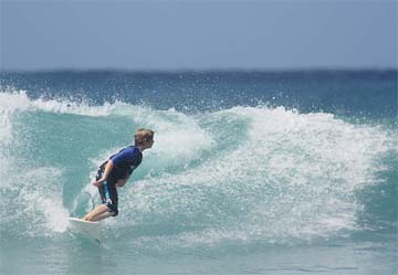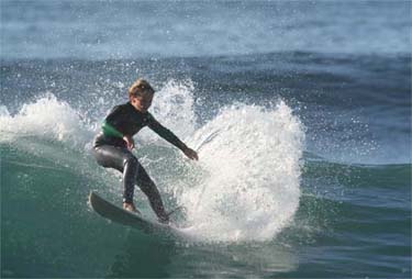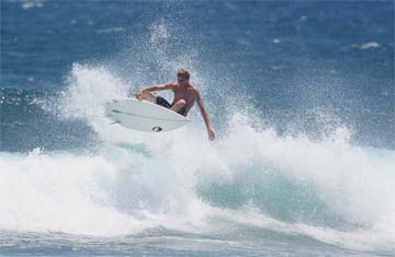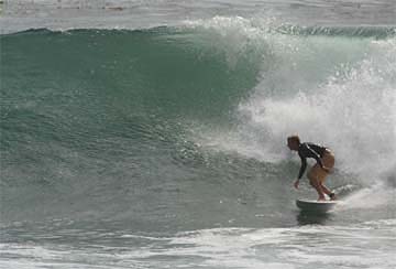 Lots of fine surf this month with pleasant, cool water and glassy conditions. North swells, south swells, west swells. Nick's been sick with the flu, but Erik's been out rippin' every day at Seawind. The other day he was working the inside right, a hot little zipper of a tube called Reptiles, when a couple of tourists swimming just north started looking panicky. Erik, at 15 a certified pool lifeguard, paddled over to find the guy, in his twenties, freaking out in the waves and doing his best to drown. Erik talked him down, got him up on his surfboard, and paddled him through the whomp to shore. The man's woman-friend had no trouble swimming in. Somebody called the paramedics, but Erik said he looked OK and paddle back out.