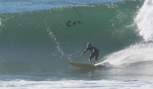 Finally! A decent north swell, big enough to pull a gun down from the garage rafters. I surfed some ten footers at Headkick, caught about six, took one nasty pitch when a wave sectioned out from under me, and in general, had a rockin' good time. Went in search of the boys, found Erik, and caught him surfing by himself at inside Salamanders: