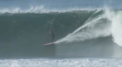 The big swell arrived today, probably the swell of the year. So--what does yours truly do? I get off work, very difficult, pull strings, cash in favors, you name it, get my wife to take pictures no less, she graciously agrees, I'm so excited: fifteen footers, maybe bigger, and a camera on the beach for the first time in decades. So, I paddle out, it's every bit as big at Breakrock as advertised, five guys out, including Brian Caldwell, who's ripping it up. Super camera conscious, I throw caution to the winds, paddle into a giant--and get pitched. Horrible hold-down. Desperately clawing my way back to the surface, more hold downs, you get the idea...